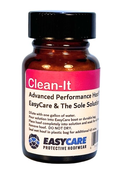 Tackle thrush, white line disease, and more. CLEAN-IT is a deep, penetrating hoof cleanser proven to be effective in eliminating even the toughest infections. Purges bacteria, fungi and spores from the deepest hoof layers and crevices, while removing dead, powdery soft remnants of tissue destroyed by fungal activity. Often effective with just one application but deeper infections may require multiple applications. Mix entire bottle with one gallon water. Soak hoof for 45-60 minutes. Remove wet hoof and place directly into another plastic bag for an additional 45 minutes. Vapors will continue to deep clean the hoof. Used Clean-It solution can be poured onto stall floor to combat environmental pathogens.