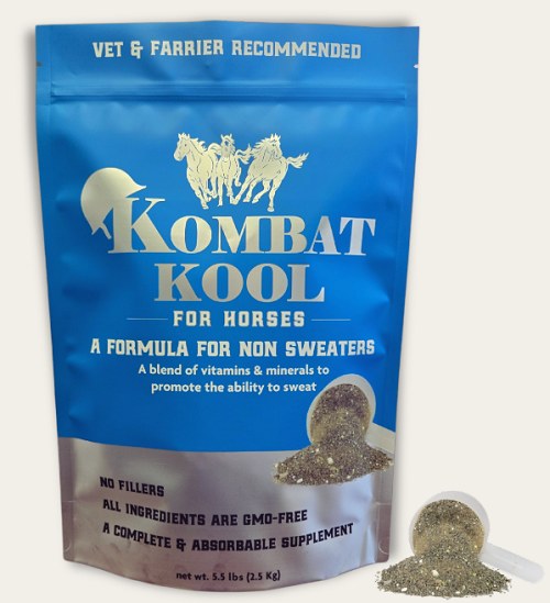 KOMBAT KOOL is a pure mineral and vitamin supplement that has no fillers to interfere with uptake (unlike other vitamin/mineral supplements). It is specially formulated for non-sweaters and will supply all of the compounds a horse needs to produce sweat.