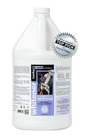 Lucky Braids Whitener is an enzymatic formula that lifts dirt and stains from your horse's coat, mane and tail without drying, stripping or leaving residue. Simply spray it on stains, wait a moment and wipe clean with a towel. Use it as an alternative to bathing or to repel dirt after grooming.
